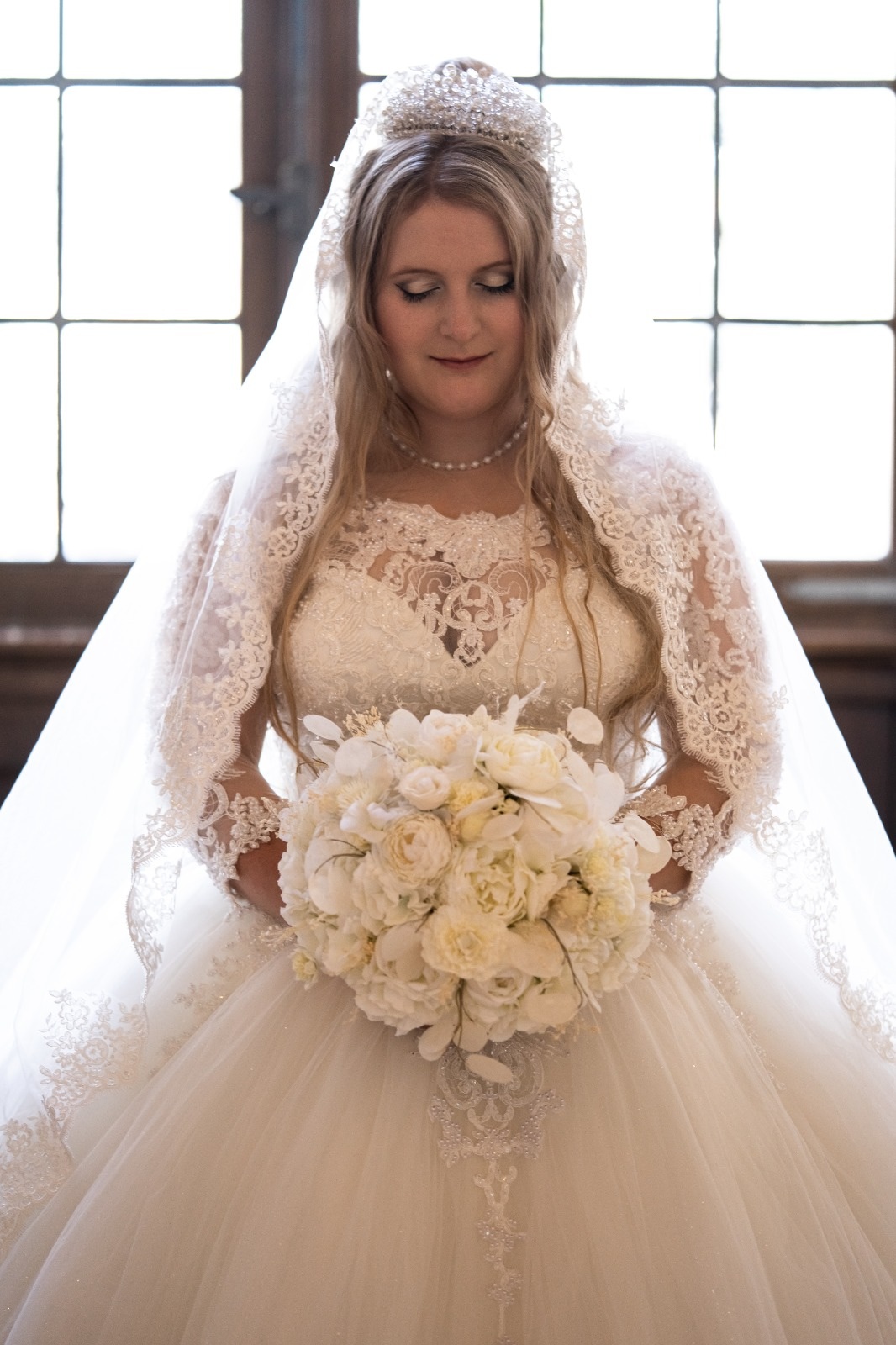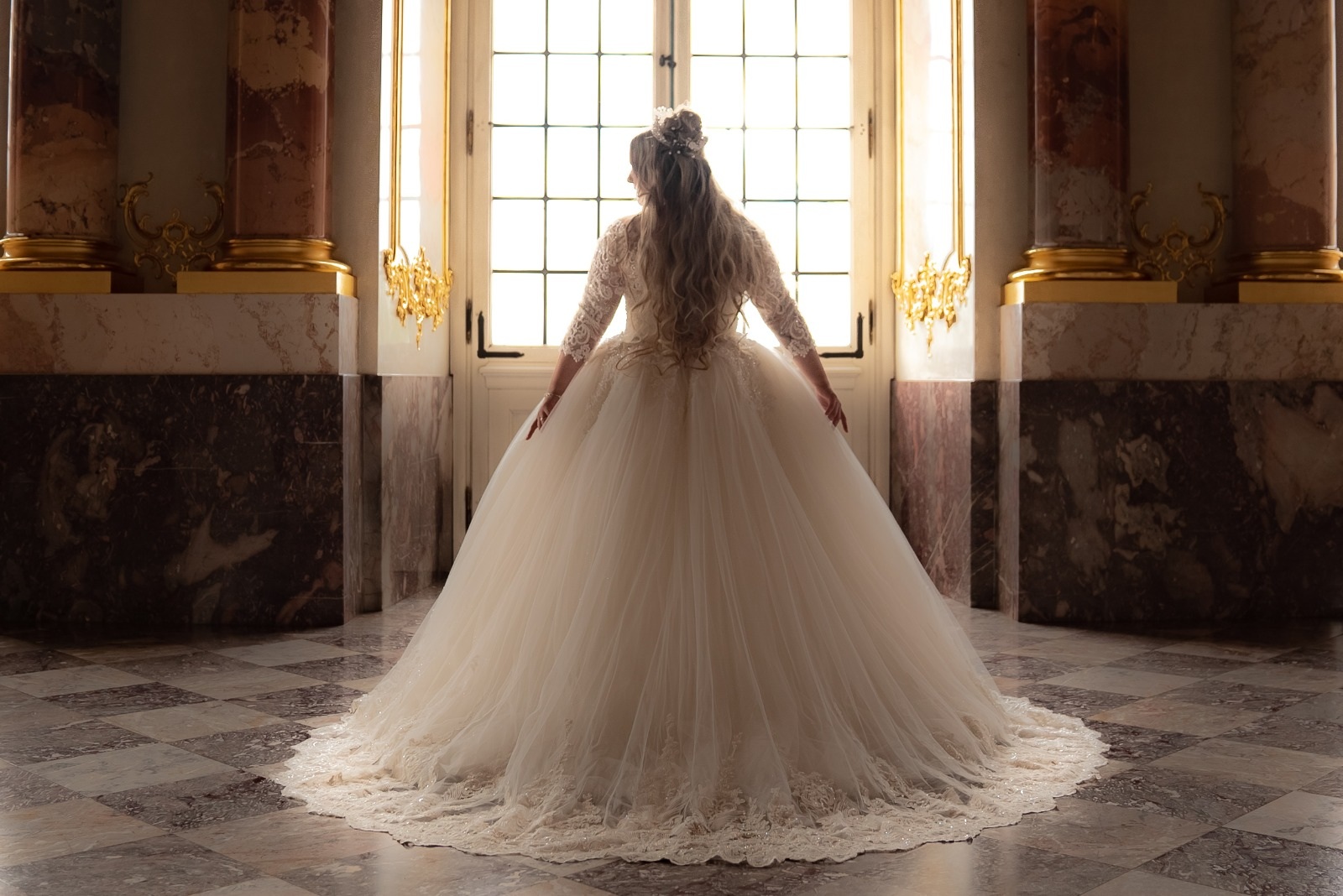 Diese besondere Atmosphäre am Hochzeitsmorgen. Der Moment, wenn die Braut ihren vollständigen Look mit Kleid, Frisur, Makeup zum ersten Mal im Spiegel betrachtet.
